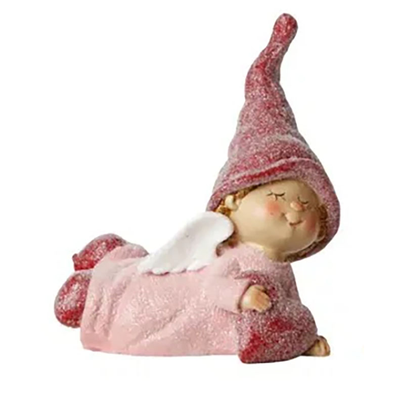 Här har vi den liggande Ängeln Klara, med sin fina rosa dräkt, röda tomteluva och skor. Hon håller i ett hjärta.