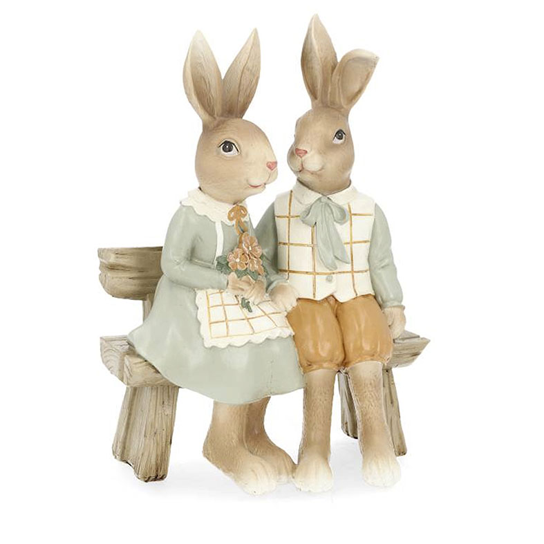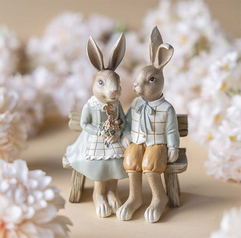 Sött kaninpar som sitter på en bänk. Perfekt som dekoration i fönstret eller på soffbordet.