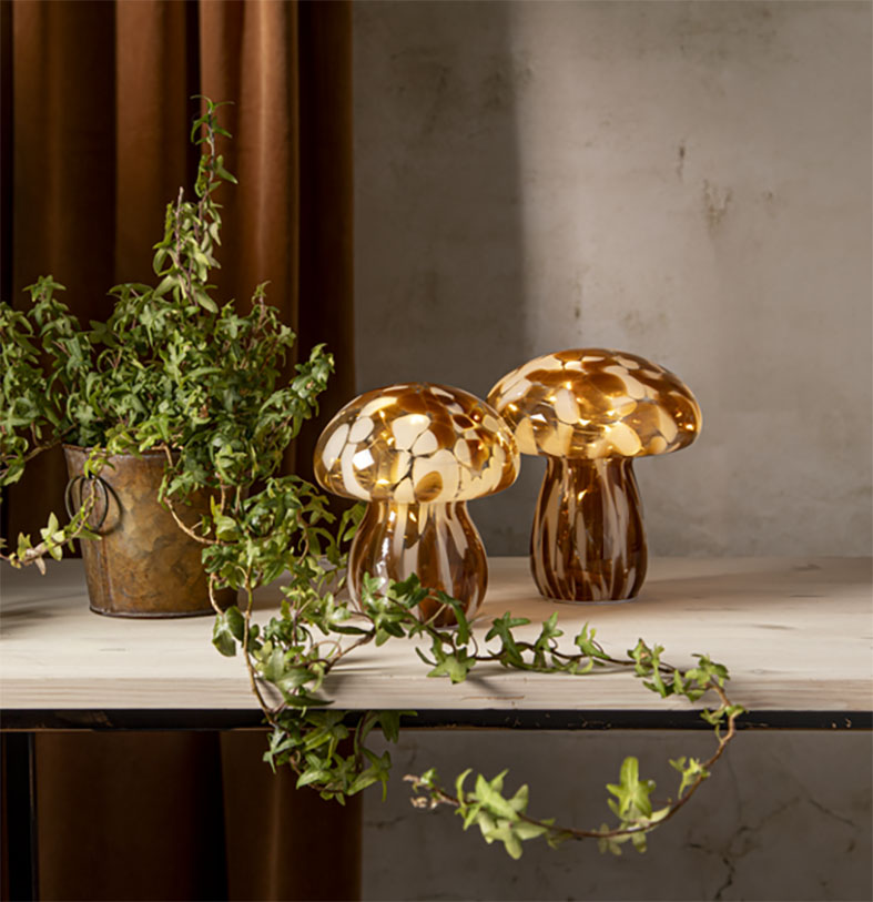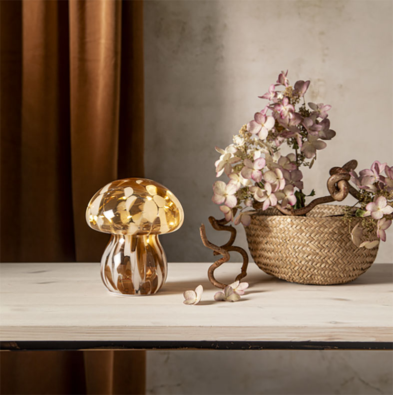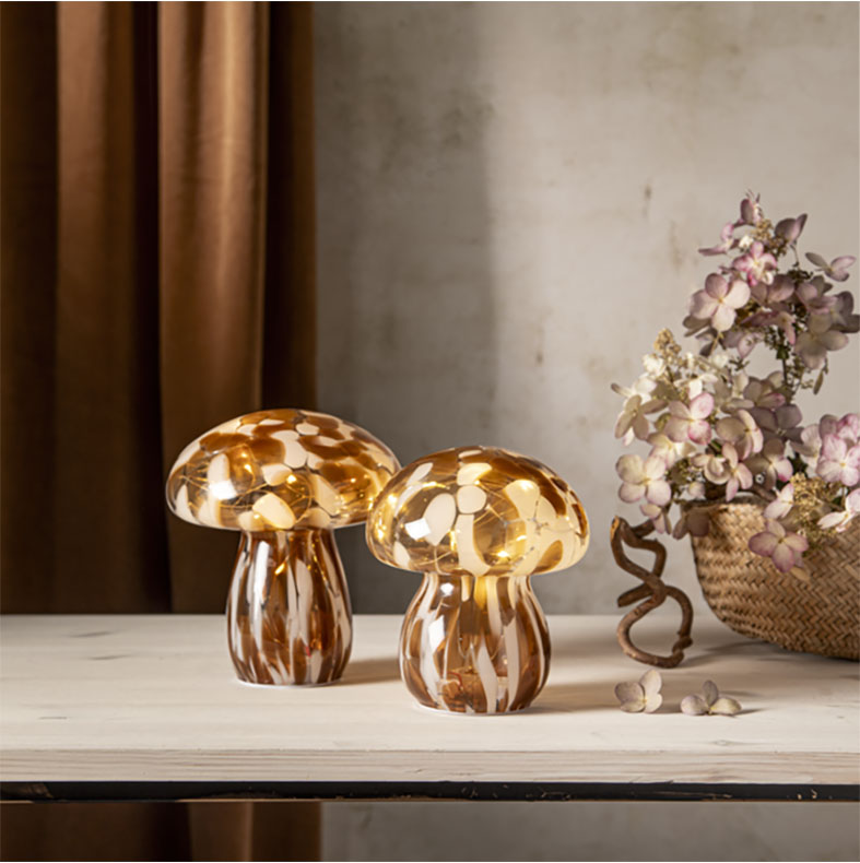 Stilfull glasdekoration i form av en svamp med snyggt mönster i brun/vit färg, varje produkt med unikt mönster. Placeras på bord eller bänk och ger ett vacker sken i varmvitt. Batteridriven för inomhusbruk. Finns i två storlekar.