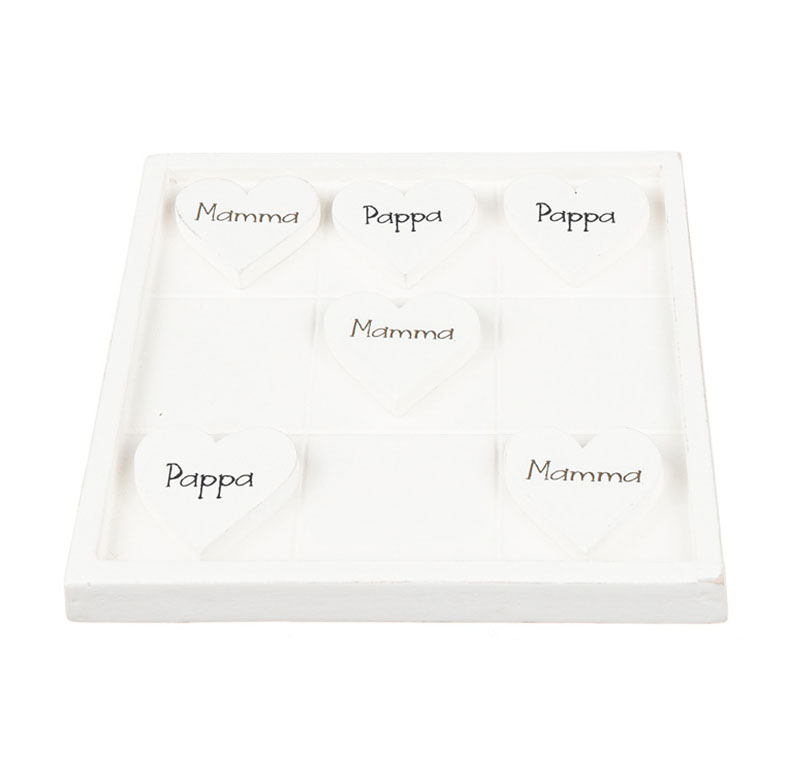 Detta är ett Tre i rad spel, med spelpjäser där det står Mamma och Pappa. Är en perfekt present.