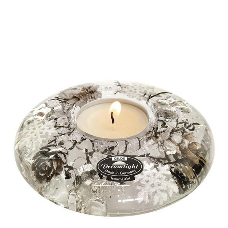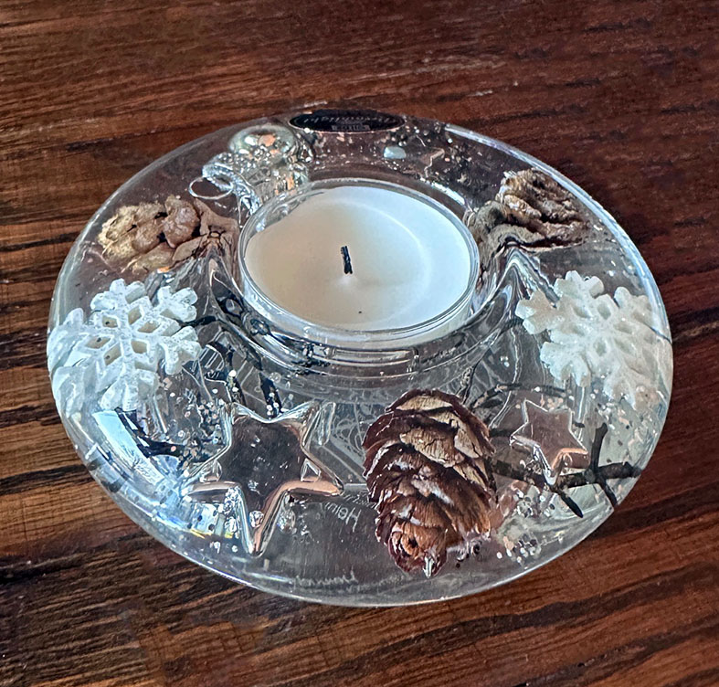 En underbar glas Värmeljushållare med gel och vinter dekorationer inuti. Format som ett ufo.